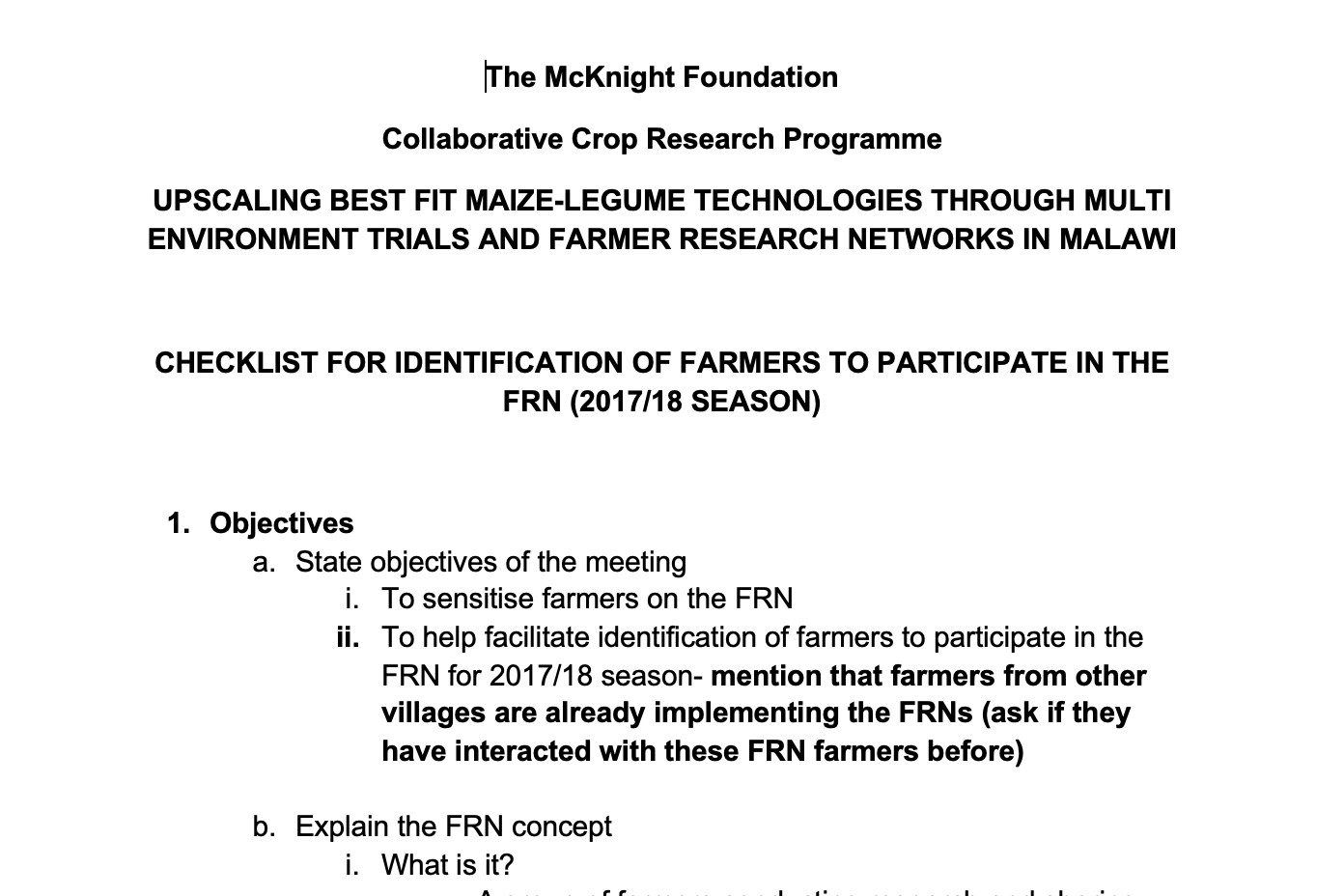 Checklist for Identification of Farmers to Participate in the FRN