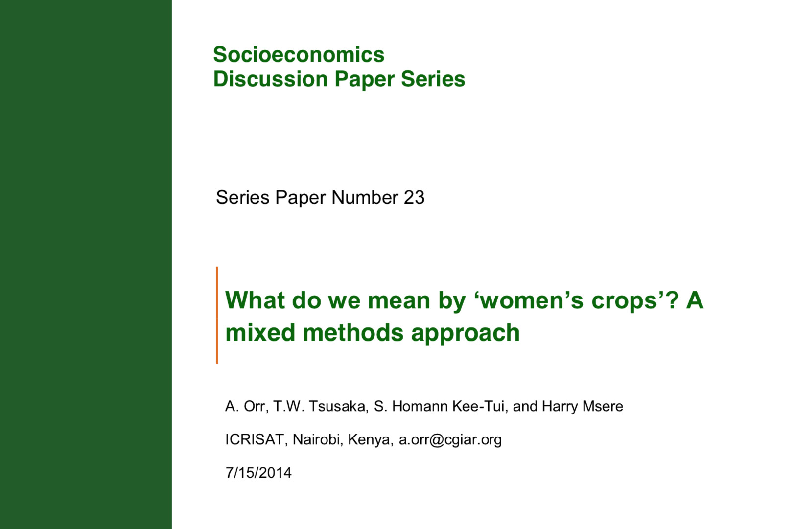 Part of the 'Socioeconomics Discussion Paper Series, published by ICRISAT. ...